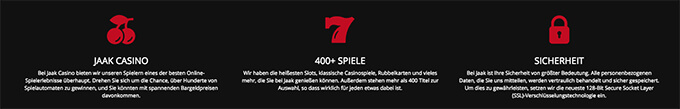 *Weitere Informationen zum Willkommensbonus sowie über die Allgemeinen Geschäftsbedingungen können Sie auf der Webseite vom Jaak Casino einsehen!