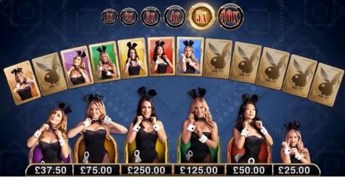 Hier sehen Sie die Playmates am unteren Bildrand aufgereiht mit unterschiedlichen Werten darunter. Oben liegen umgedeckte Karten. Sie müssen nun Paare bilden und die Playmates den Karten zuordnen. Wenn Sie ein paar nach dem zweiten Klick finden, erhalten Sie dafür alle 6 Cashpreise der Playmates. Bei jedem Klick nach der zweiten Wahl, erhöht sich der Multiplikator immer um x2, bis zu x10 beim 7. Klick.